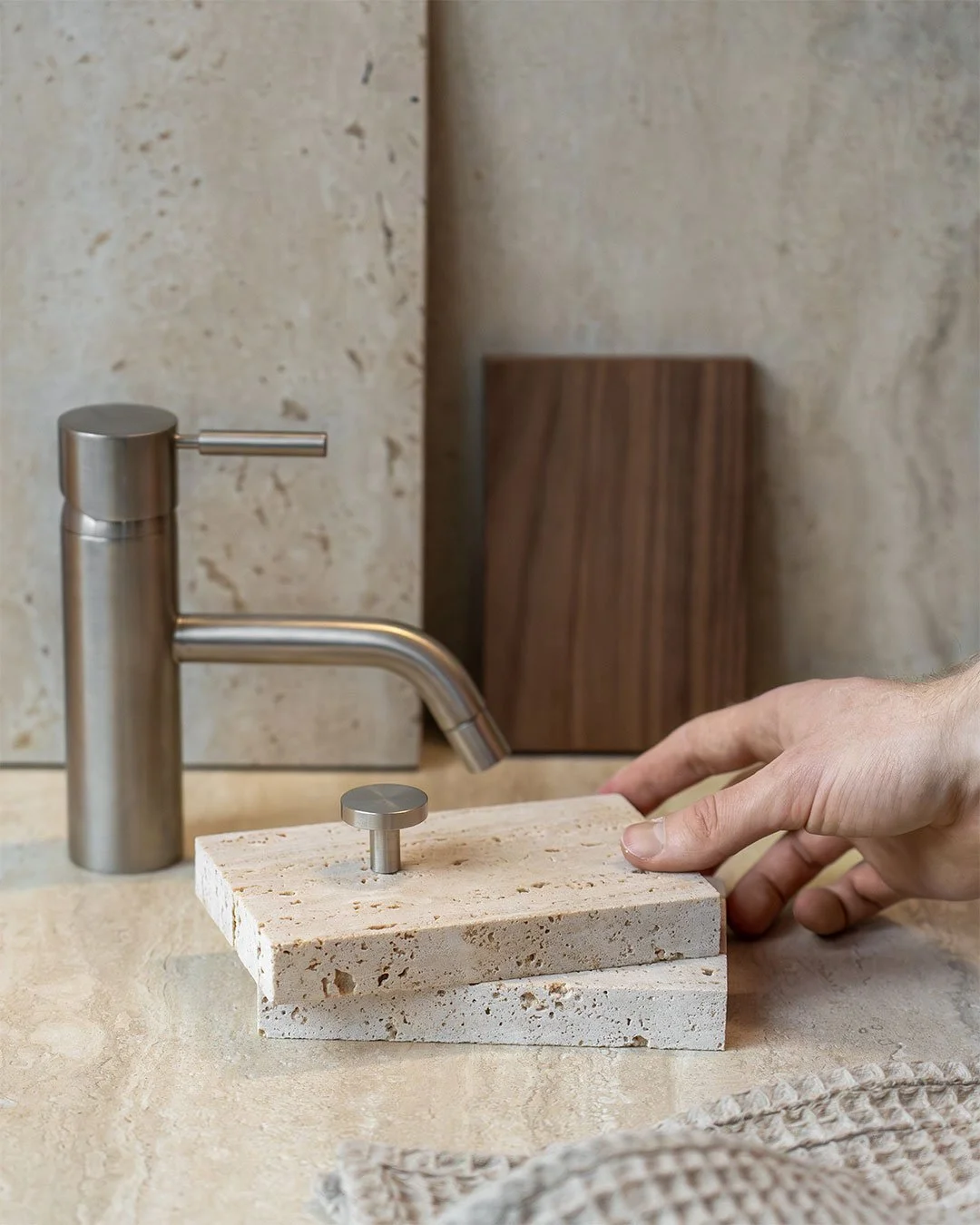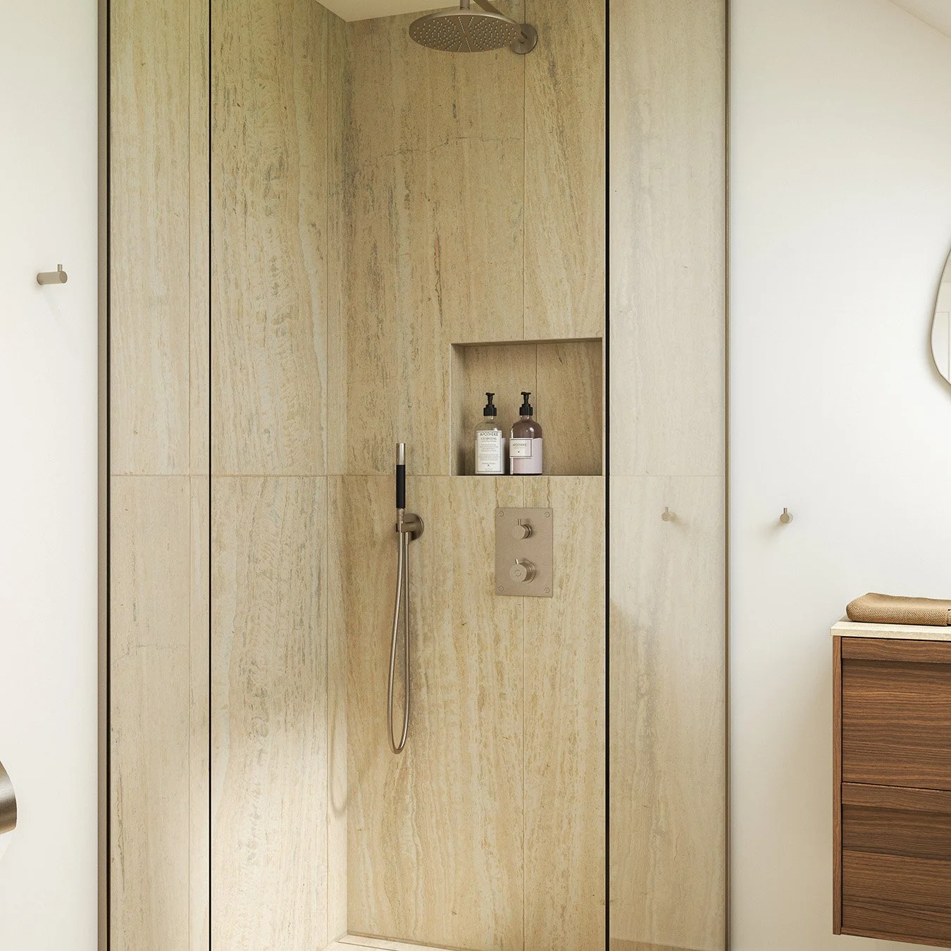 Rolige, naturlige nuancer fra materialer som travertin og valnød komplementeres af stålets enkle elegance, hvilket resulterer i et rum, der føles både moderne og evigt aktuelt.